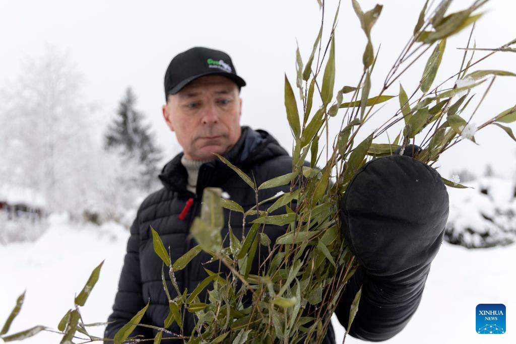 This photo taken on Jan. 8, 2024 shows agricultural advisor Jari Luokkakallio carrying bamboo in Ahtari, Finland. Driven by a passion for giant pandas, Finnish agronomists are learning how to cultivate bamboo in freezing temperatures not normally conducive to growing the primary food source for these iconic animals. (Photo by Matti Matikainen/Xinhua)