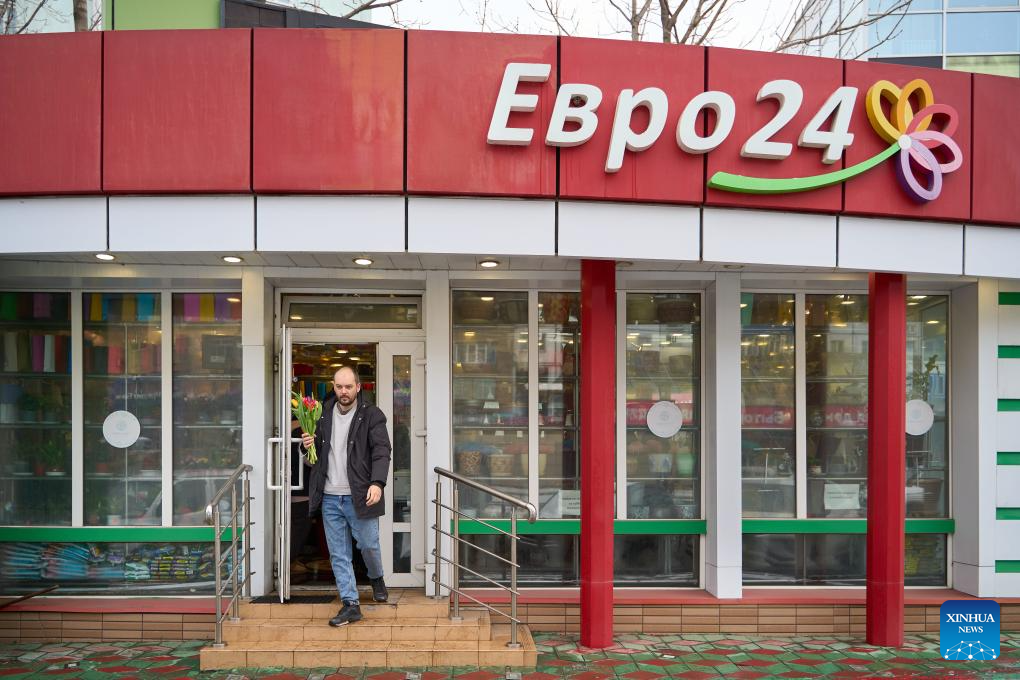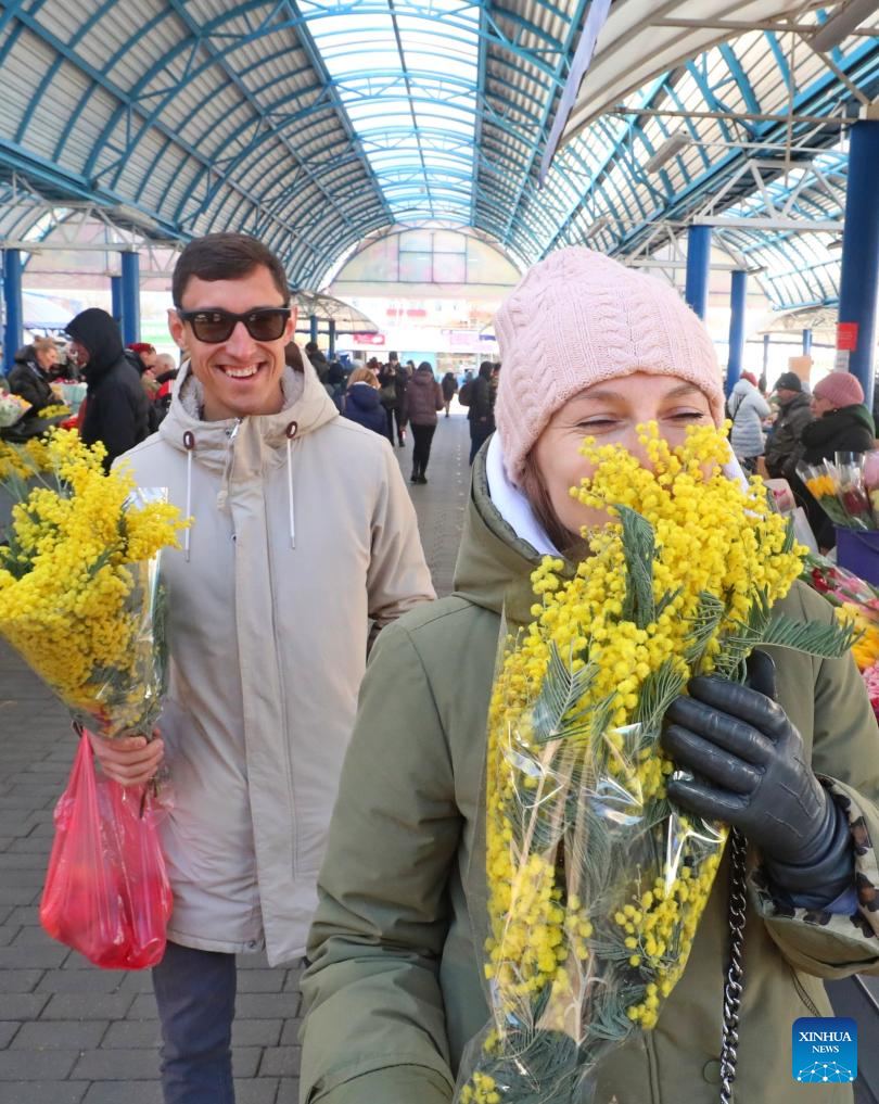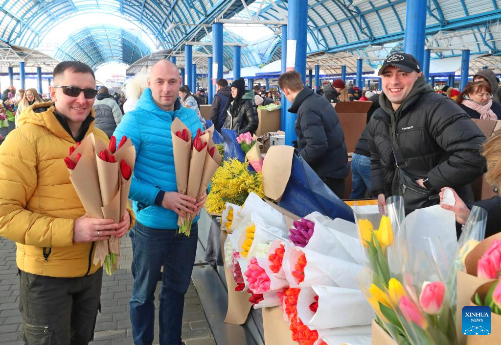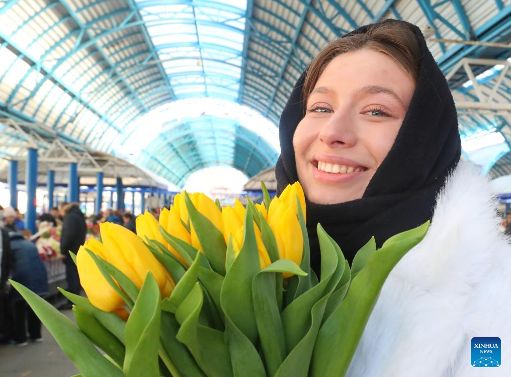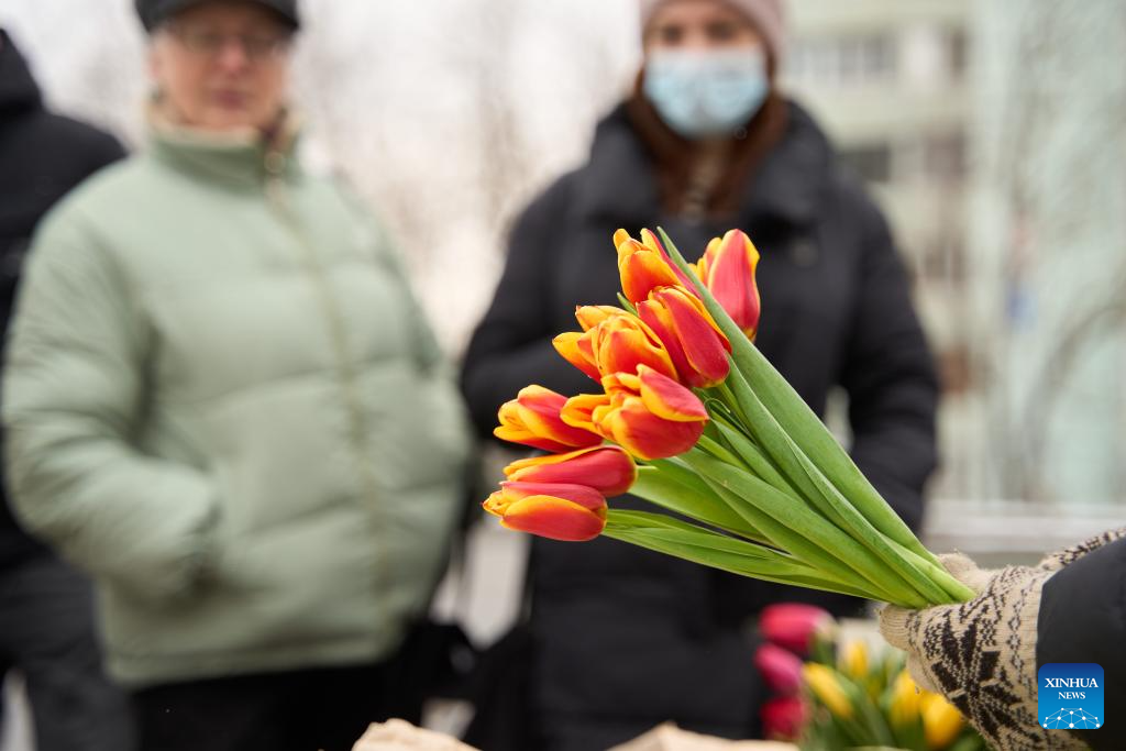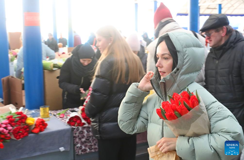 People visit a flower market in celebration of the International Women's Day in Minsk, Belarus, March 7, 2024. (Photo by Henadz Zhinkov/Xinhua)