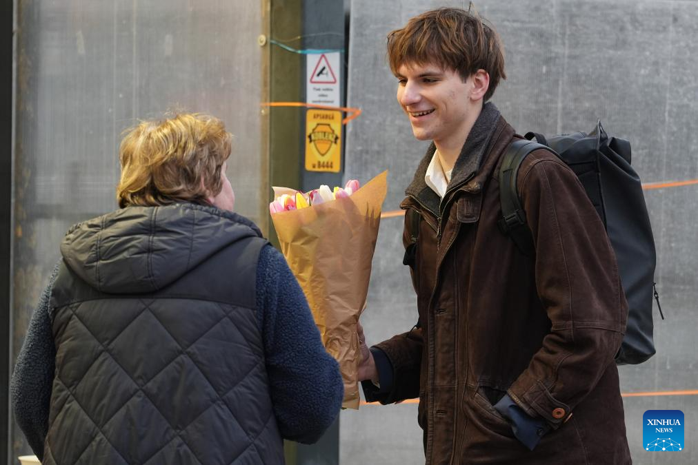 A young man gives a bouquet of flowers to a woman on International Women's Day in Riga, Latvia, March 8, 2024. (Photo by Edijs Palens/Xinhua)
