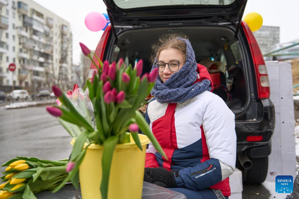 A flower stall owner waits for customers on a street in Vladivostok, Russia, March 8, 2024. Local residents here purchased flowers for their female relatives in celebration of the International Women's Day. (Photo by Guo Feizhou/Xinhua)
