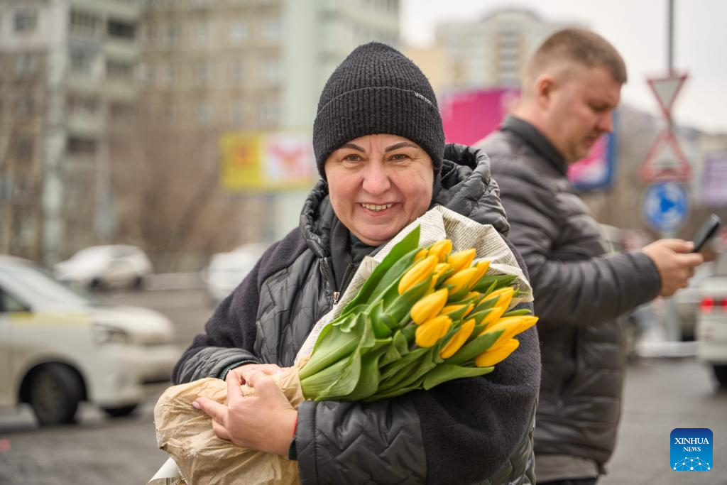 Tulips are pictured on a street in Vladivostok, Russia, March 8, 2024. Local residents here purchased flowers for their female relatives in celebration of the International Women's Day. (Photo by Guo Feizhou/Xinhua)