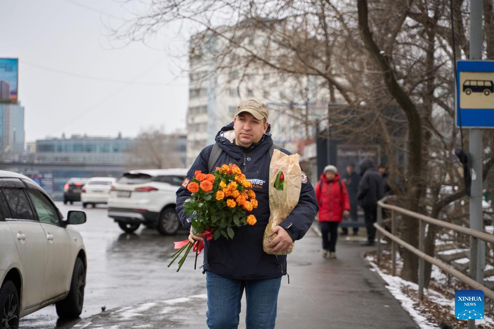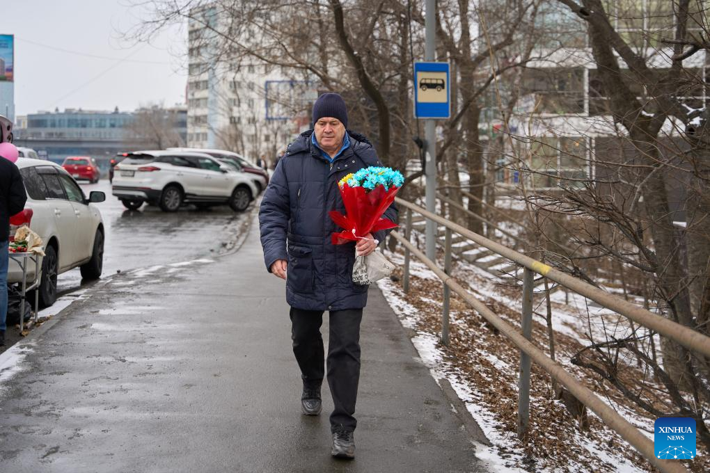 A man holding a bouquet of flowers walks on a street in Vladivostok, Russia, March 8, 2024. Local residents purchased flowers for their female relatives in celebration of the International Women's Day. (Photo by Guo Feizhou/Xinhua)