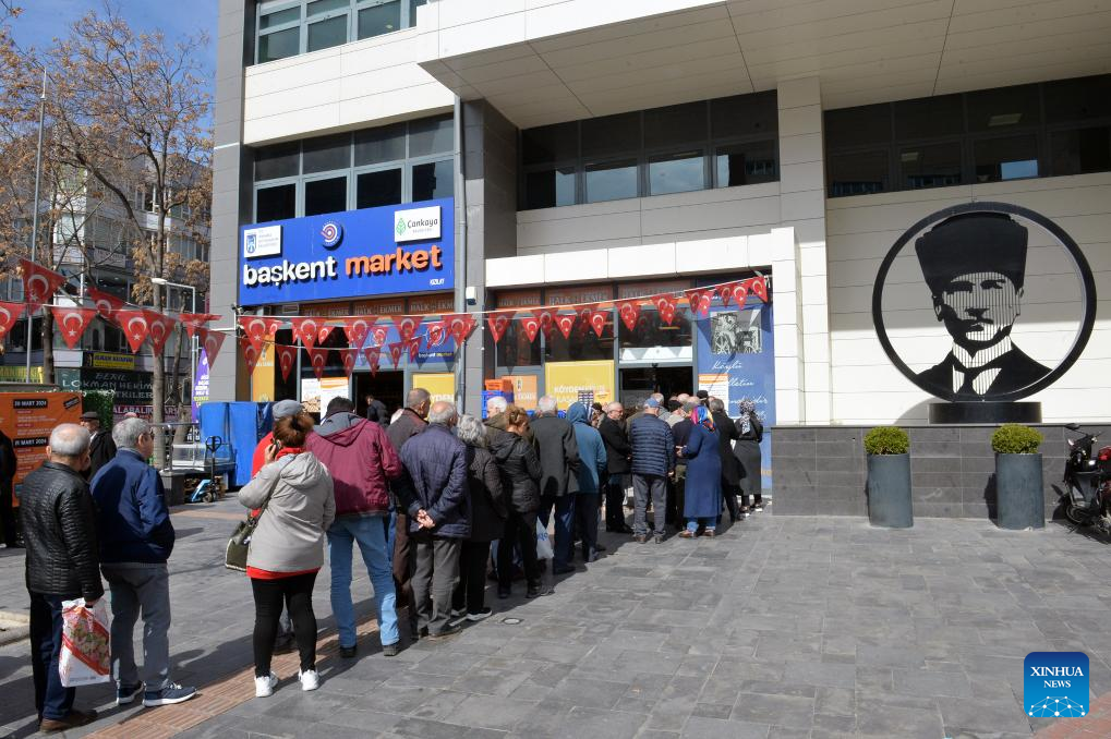 People line up to buy groceries in front of a store during Ramadan in Ankara, Türkiye, on March 11, 2024. As the holy month of Ramadan begins, Turks are embracing it with a mixture of joy and worry due to unprecedented economic challenges gripping their nation. (Photo by Mustafa Kaya/Xinhua)
