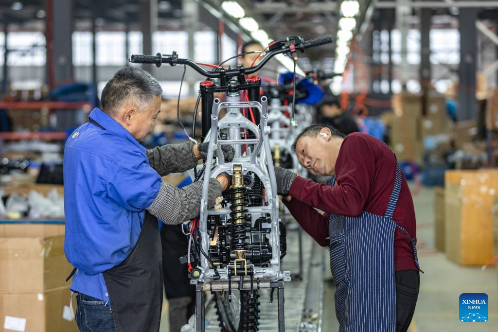 Workers test motorcycles at the Chongqing Hawe New Energy Co., Ltd. in Bishan District of Chongqing, southwest China, March 15, 2024. The products of the company will be transported to Europe via China-Europe freight train service. Benefiting from the increase of train trips and the launch of new freight train routes, including two direct rail routes to Spain and Türkiye, the city of Chongqing has seen increase in its export via China-Europe freight train service this year.