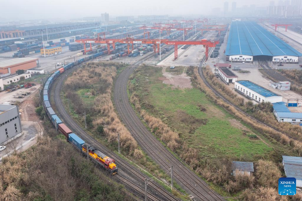 An aerial drone photo taken on March 7, 2024 shows a China-Europe freight train loaded with machinery, automobiles and auto parts pulling out of a railway station in Chongqing, southwest China. Benefiting from the increase of train trips and the launch of new freight train routes, including two direct rail routes to Spain and Türkiye, the city of Chongqing has seen increase in its export via China-Europe freight train service this year.