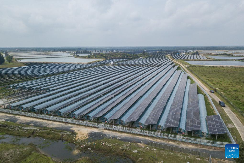 An aerial drone photo taken on March 15, 2024 shows a photovoltaic power station and vegetable greenhouses at Wangtangnan Village of Wengtian Town in Wenchang City, south China's Hainan Province.