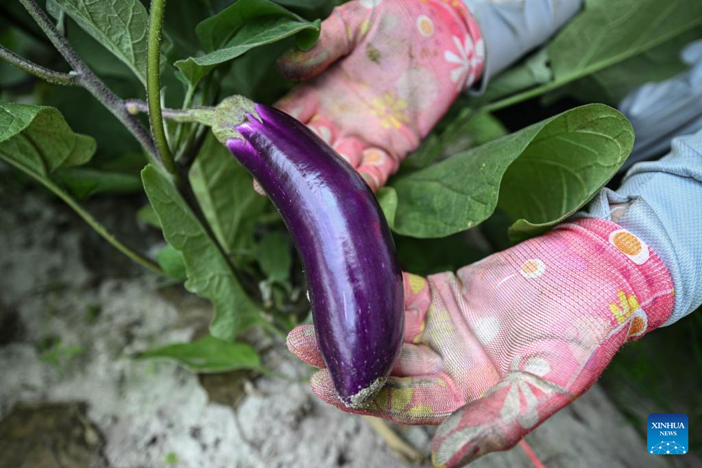 This photo taken on March 15, 2024 shows an eggplant in a greenhouse at Wangtangnan Village of Wengtian Town in Wenchang City, south China's Hainan Province.