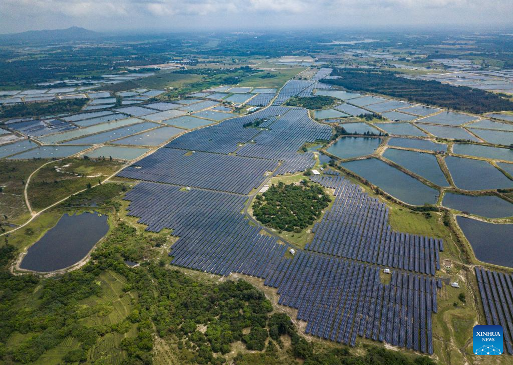 An aerial drone photo taken on March 15, 2024 shows a photovoltaic power station at Wangtangnan Village of Wengtian Town in Wenchang City, south China's Hainan Province.