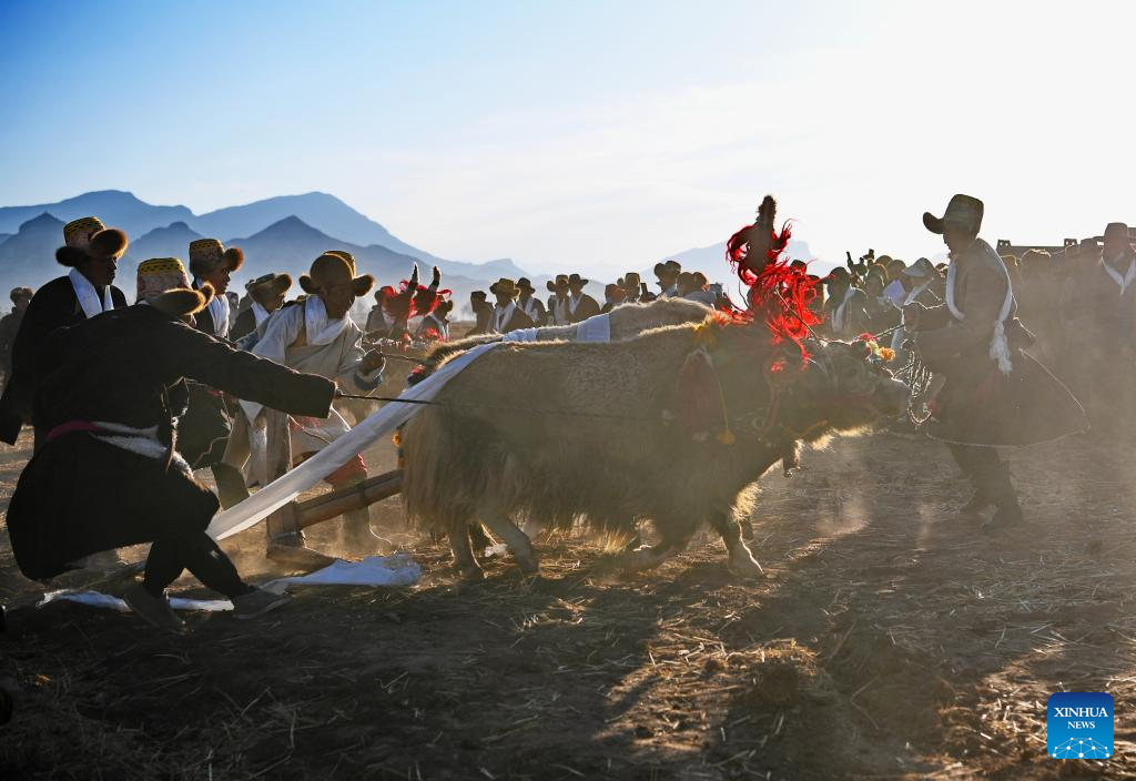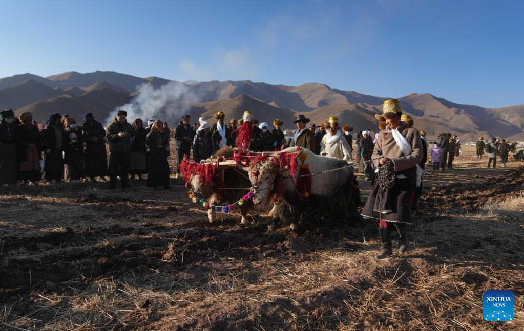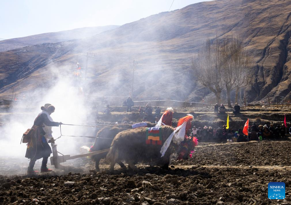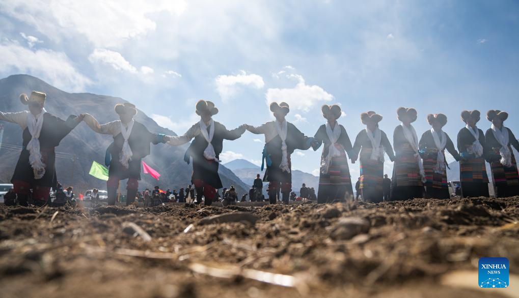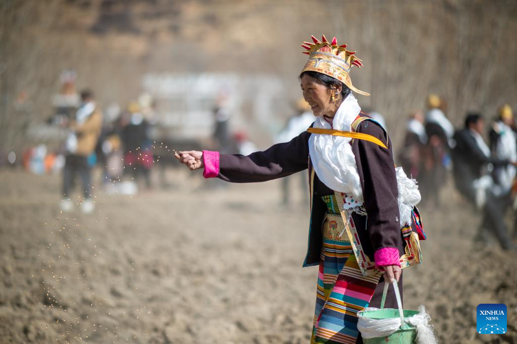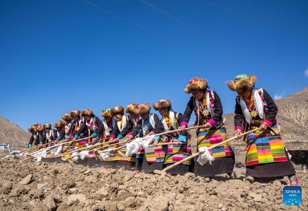 Farmers participate in a ceremony marking the start of spring farming in Doilungdeqen district of Lhasa, southwest China's Xizang Autonomous Region, March 16, 2024. Ceremonies marking the start of spring farming were held in Xizang on Saturday during which farmers held "chema" (a wooden box filled with colorful grains and barley flour, symbolizing good luck and prosperity in Tibetan culture), sang songs, and toasted each other with barley wine. The ceremony holds great significance as it marks the beginning of a new year's farming season and serves as a prayer for favorable weather and bountiful harvests. It is considered an important ritual in the farming regions of Xizang. (Xinhua/Tenzin Nyida)