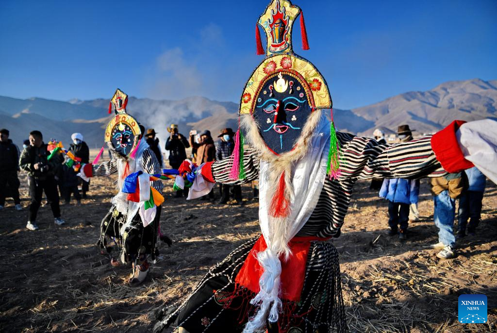 Farmers perform traditional opera during a ceremony marking the start of spring farming in Codoi Town in Lhunzhub County of Lhasa, southwest China's Xizang Autonomous Region, March 16, 2024. Ceremonies marking the start of spring farming were held in Xizang on Saturday during which farmers held "chema" (a wooden box filled with colorful grains and barley flour, symbolizing good luck and prosperity in Tibetan culture), sang songs, and toasted each other with barley wine. The ceremony holds great significance as it marks the beginning of a new year's farming season and serves as a prayer for favorable weather and bountiful harvests. It is considered an important ritual in the farming regions of Xizang. (Xinhua/Zhang Rufeng)