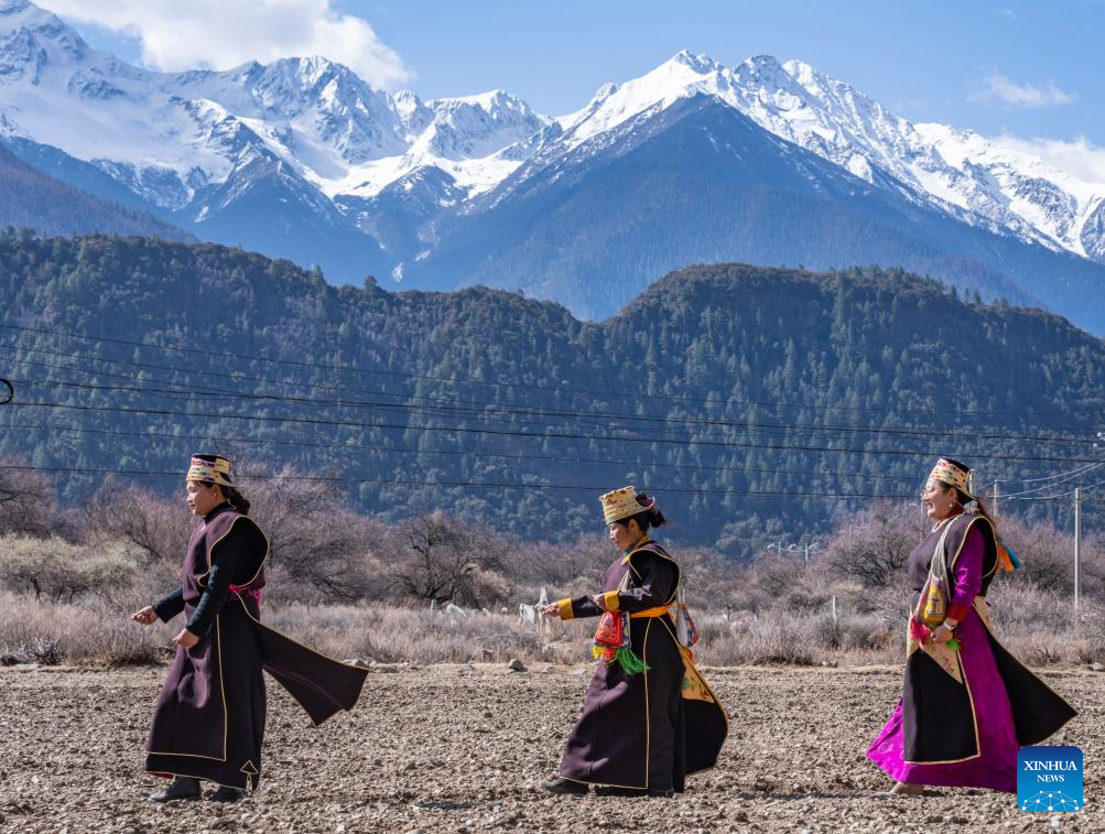 Farmers participate in a ceremony marking the start of spring farming in a village of Gongbo'Gyamda County, Nyingchi City, southwest China's Xizang Autonomous Region, March 16, 2024. Ceremonies marking the start of spring farming were held in Xizang on Saturday during which farmers held "chema" (a wooden box filled with colorful grains and barley flour, symbolizing good luck and prosperity in Tibetan culture), sang songs, and toasted each other with barley wine. The ceremony holds great significance as it marks the beginning of a new year's farming season and serves as a prayer for favorable weather and bountiful harvests. It is considered an important ritual in the farming regions of Xizang. (Xinhua/Sun Fei)