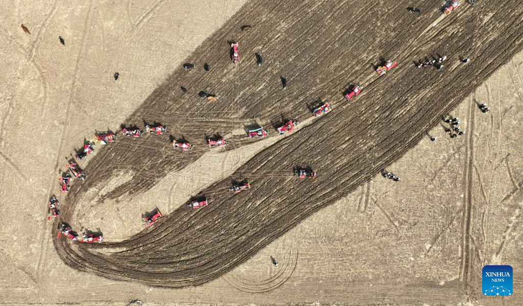 An aerial drone photo taken on March 16, 2024 shows people participating in a ceremony marking the start of spring farming in Qangka of Lhunzhub County of Lhasa, southwest China's Xizang Autonomous Region. Ceremonies marking the start of spring farming were held in Xizang on Saturday during which farmers held "chema" (a wooden box filled with colorful grains and barley flour, symbolizing good luck and prosperity in Tibetan culture), sang songs, and toasted each other with barley wine. The ceremony holds great significance as it marks the beginning of a new year's farming season and serves as a prayer for favorable weather and bountiful harvests. It is considered an important ritual in the farming regions of Xizang. (Xinhua/Jigme Dorje)