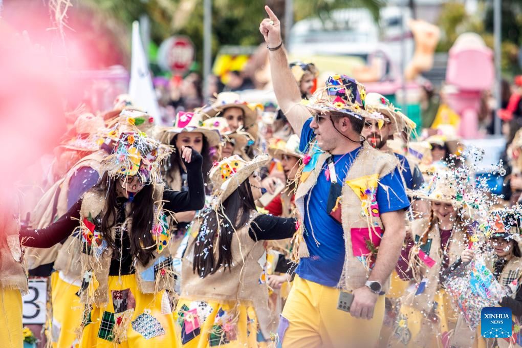 People wearing carnival costumes take part in the traditional Limassol Carnival parade in Limassol, Cyprus, March 17, 2024. (Photo by George Christophorou/Xinhua)