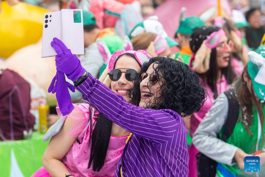 Two women take selfies during the traditional Limassol Carnival parade in Limassol, Cyprus, March 17, 2024. (Photo by George Christophorou/Xinhua)