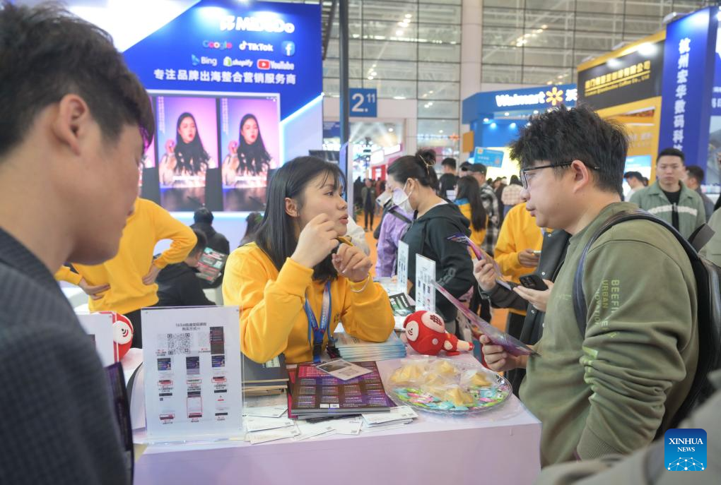 An exhibitor talks with a visitor at the 4th China Cross-border E-commerce Trade Fair in Fuzhou, southeast China's Fujian Province, March 18, 2024. The trade fair kicked off here on Monday, attracting more than 30 cross-border e-commerce platforms worldwide and over 1,500 exhibitors across China. (Xinhua/Lin Shanchuan)