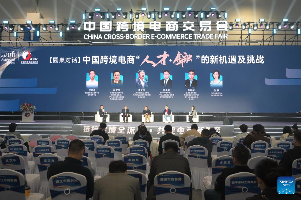 This photo taken on March 18, 2024 shows a forum of the 4th China Cross-border E-commerce Trade Fair in Fuzhou, southeast China's Fujian Province. The trade fair kicked off here on Monday, attracting more than 30 cross-border e-commerce platforms worldwide and over 1,500 exhibitors across China. (Xinhua/Lin Shanchuan)