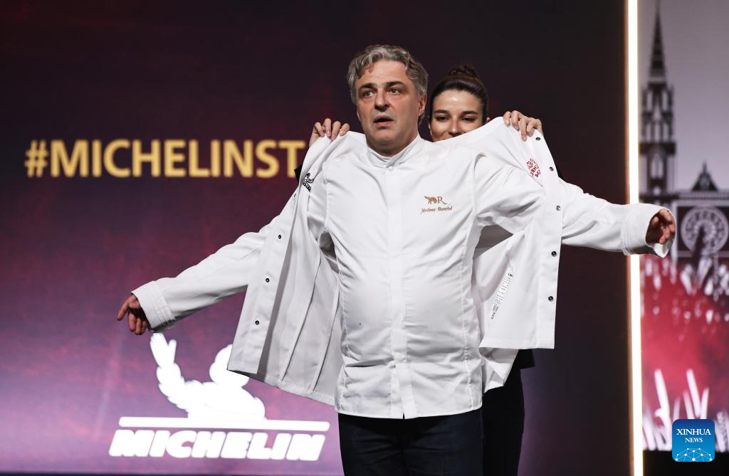 French chef Jerome Banctel changes his new chef jacket after being awarded a third Michelin star during the Michelin Guide for France 2024 awards ceremony in Tours, France, March 18, 2024. The Michelin Guide launched its 2024 France edition on Monday in Tours. (Xinhua/Gao Jing)