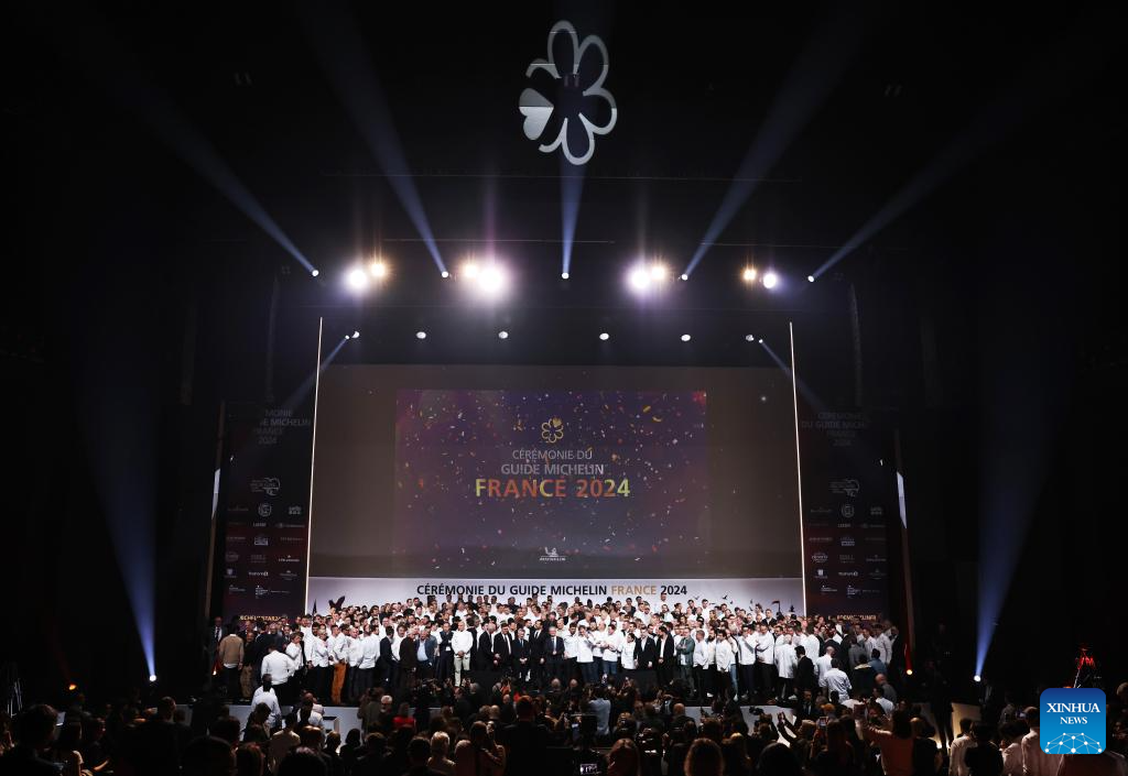 Chefs take a family photo during the Michelin Guide for France 2024 awards ceremony in Tours, France, March 18, 2024. The Michelin Guide launched its 2024 France edition on Monday in Tours. (Xinhua/Gao Jing)