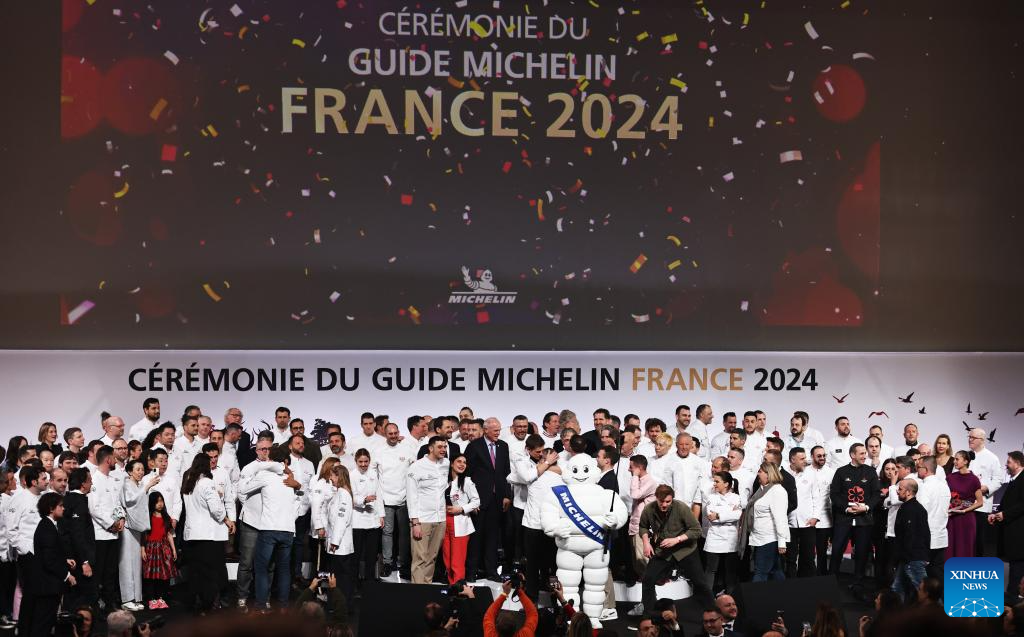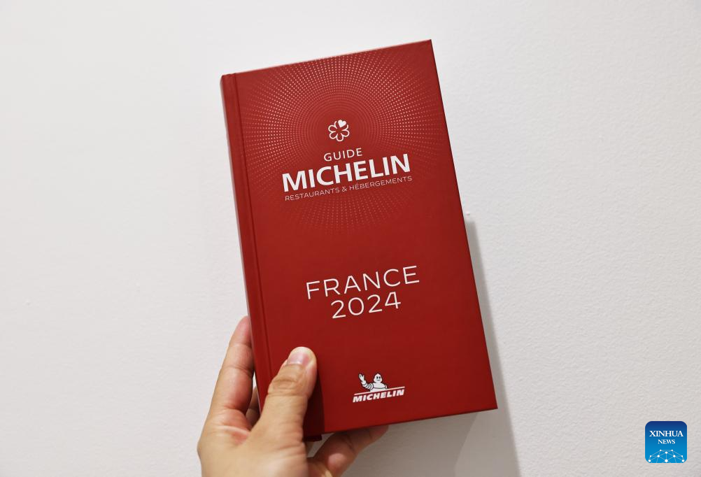 The 2024 edition of the Michelin Guide for France is pictured in Tours, France, March 18, 2024. The Michelin Guide launched its 2024 France edition on Monday in Tours. (Xinhua/Gao Jing)