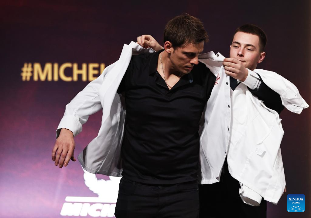 French chef Fabien Ferre changes his new chef jacket after being awarded a third Michelin star during the Michelin Guide for France 2024 awards ceremony in Tours, France, March 18, 2024. The Michelin Guide launched its 2024 France edition on Monday in Tours. (Xinhua/Gao Jing)