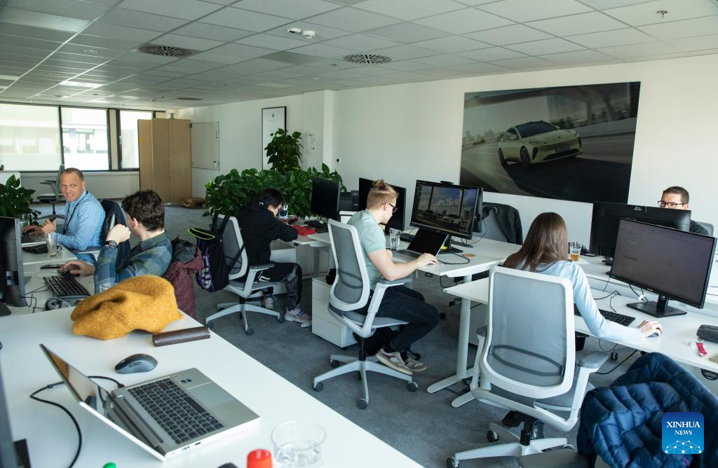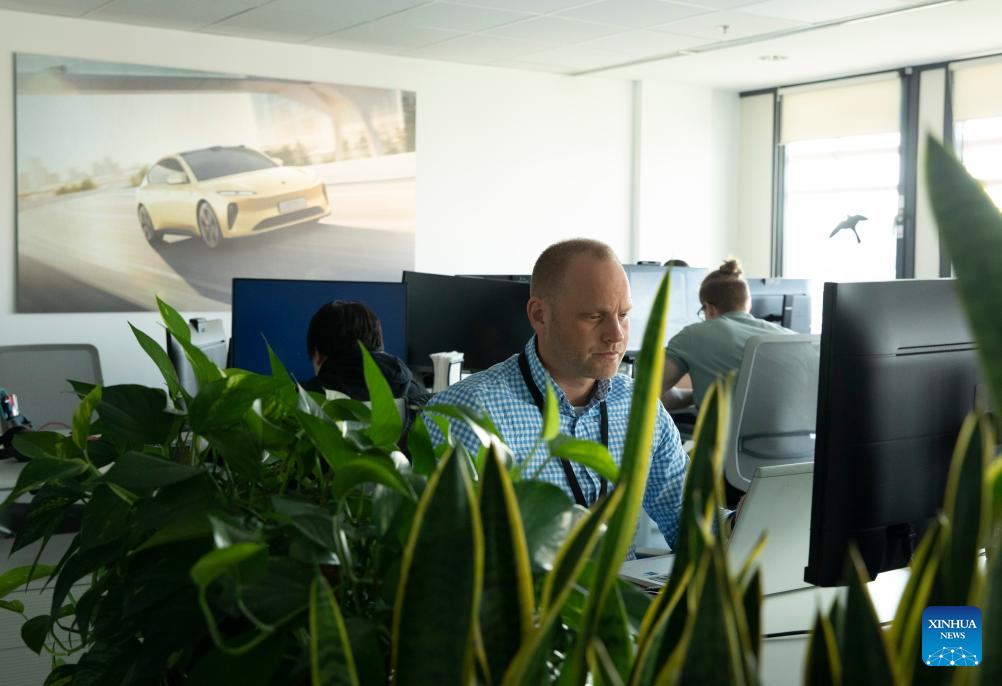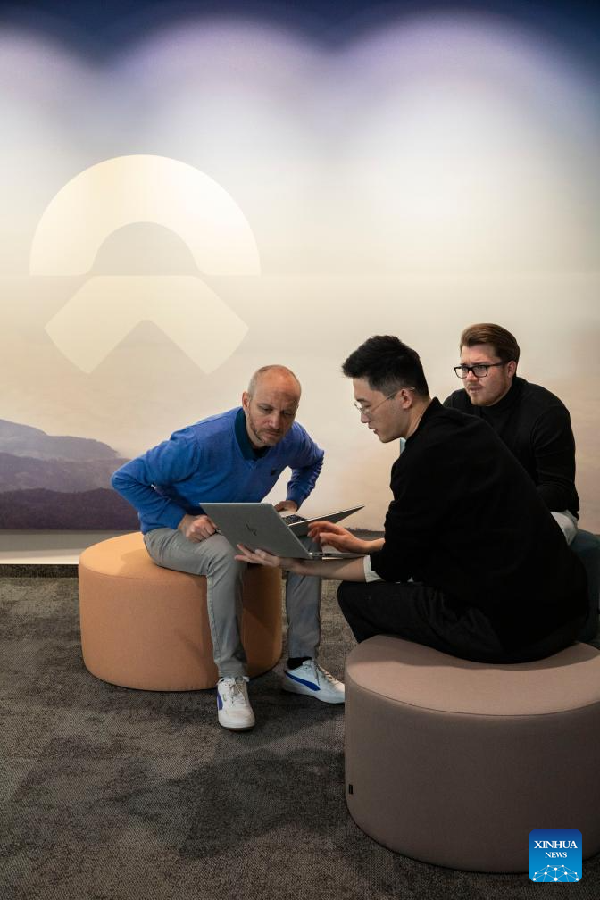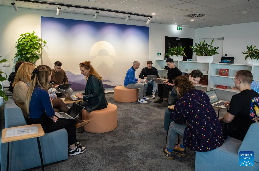(240318) -- BUDAPEST, March 18, 2024 (Xinhua) -- Staff members work at the NIO Business Service Center (BSC) in Budapest, Hungary, March 18, 2024. The NIO Business Service Center (BSC) was established in 2022, with core functions covering customer support, finance, human resources, and information technology solutions within the European region. (Xinhua/Zhang Fan)
