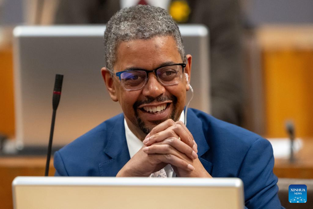 Photo taken on March 20, 2024 shows Vaughan Gething in the Senedd, the Welsh parliament, in Cardiff, Wales, Britain. Vaughan Gething was confirmed as Wales' new first minister by the Welsh parliament on Wednesday. (Welsh Parliament/Handout via Xinhua)