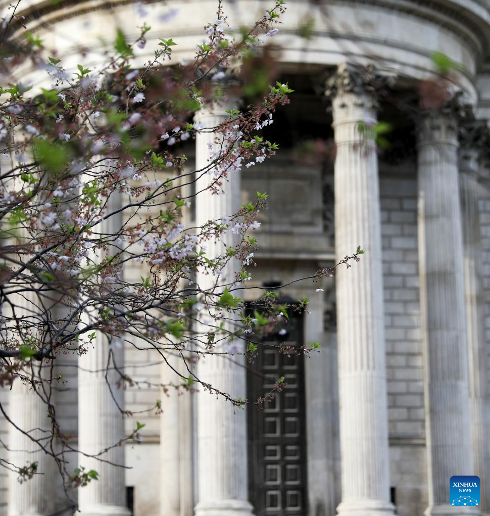Cherry blossoms are pictured near St. Paul's Cathedral in London, Britain, March 20, 2024. (Xinhua/Li Ying)