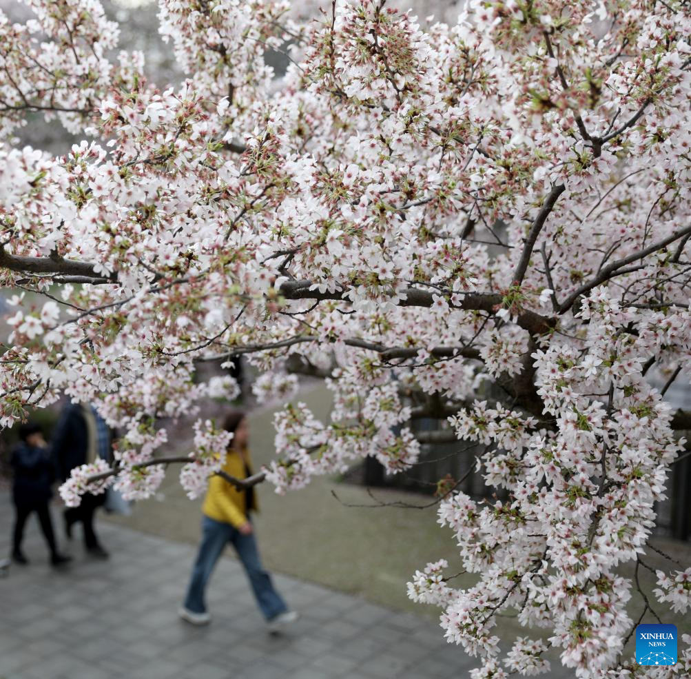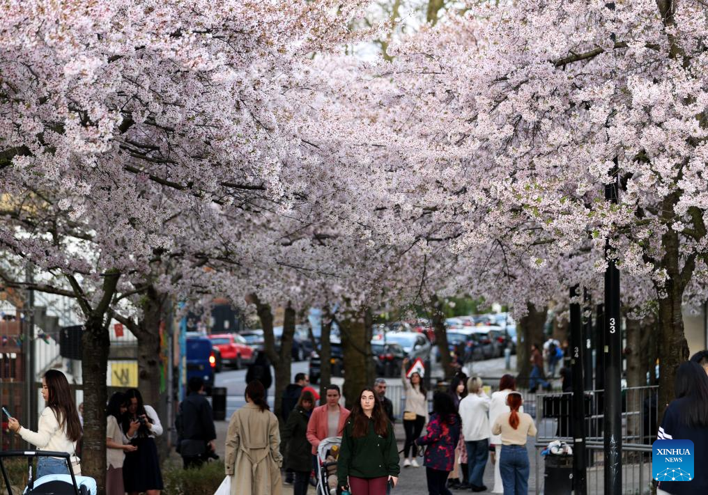 People walk under blooming cherry trees in London, Britain, March 20, 2024. (Xinhua/Li Ying)