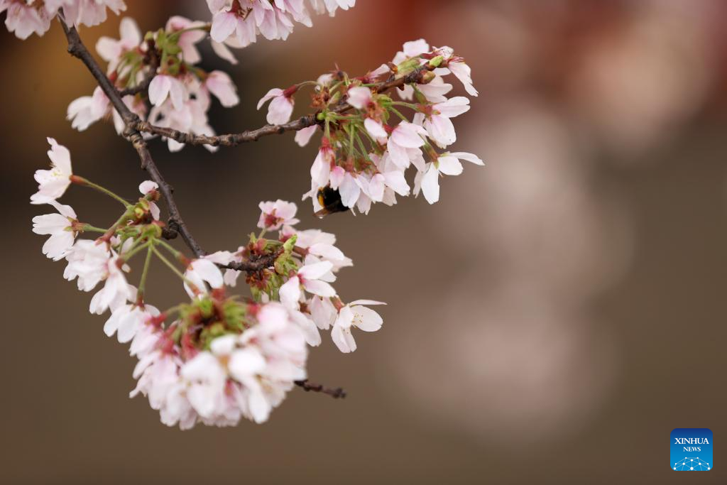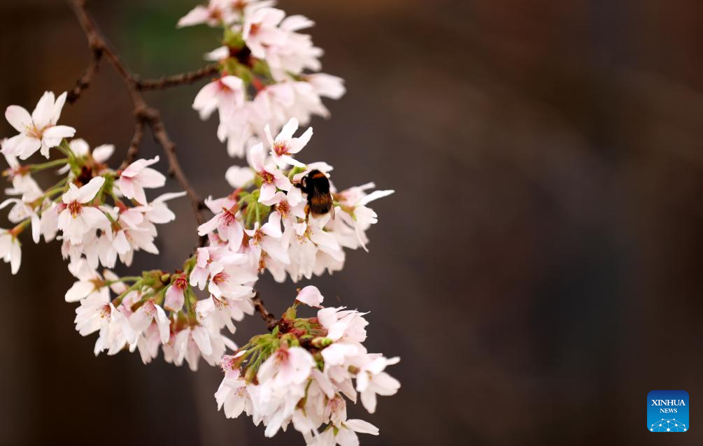 A bee is seen on a blooming cherry tree in London, Britain, March 20, 2024. (Xinhua/Li Ying)