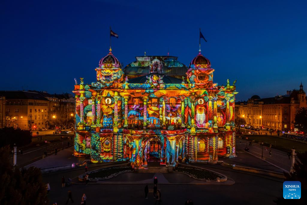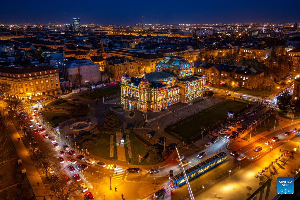 A drone photo taken on March 20, 2024 shows the illuminated Croatian National Theater during the Festival of Lights in Zagreb, Croatia. (Photo by Igor Kralj/PIXSELL via Xinhua)