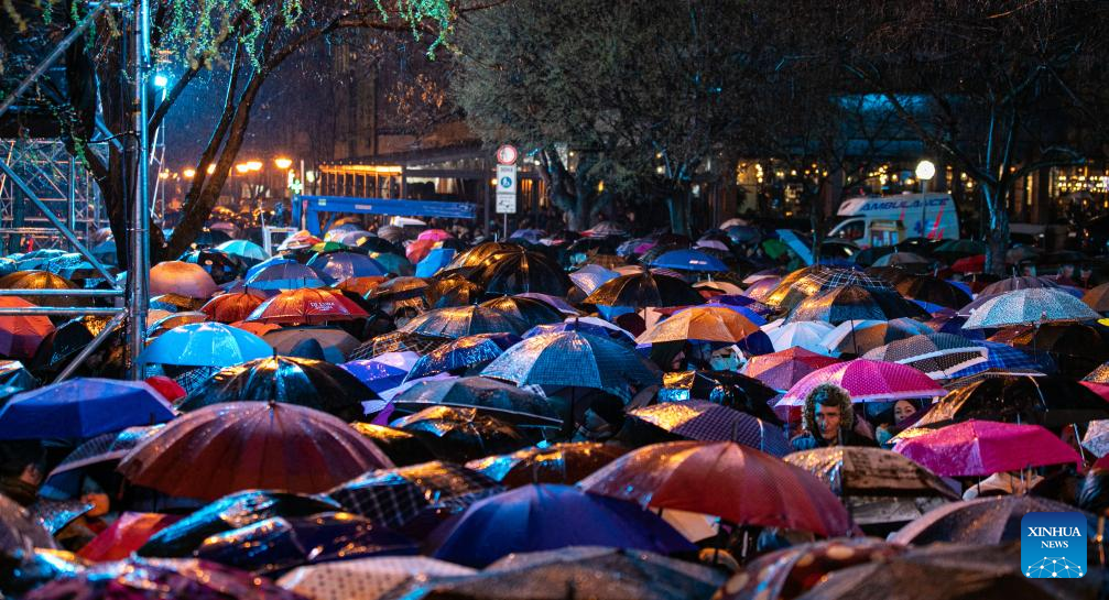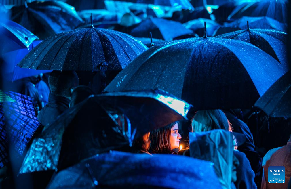 People attend a commemoration event marking the 25th anniversary of NATO bombing of Yugoslavia, in Prokuplje, Serbia, on March 24, 2024. Serbia will never surrender its province of Kosovo and Metohija nor join the NATO alliance, said Serbian President Aleksandar Vucic here Sunday at a commemoration event marking the 25th anniversary of NATO bombing of Yugoslavia. (Photo by Wang Wei/Xinhua)