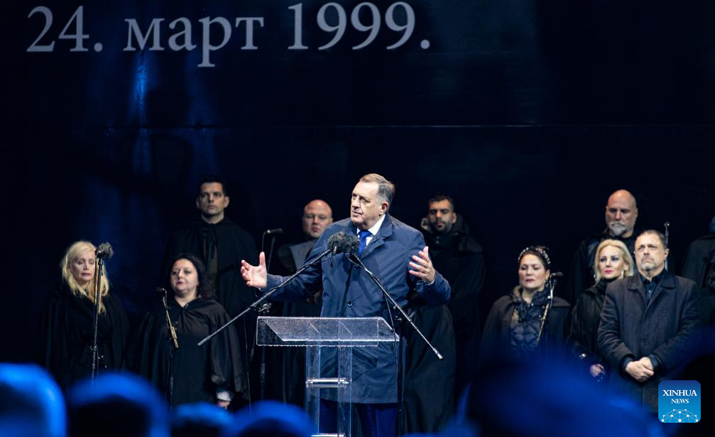 President of Republika Srpska Milorad Dodik speaks at a commemoration event marking the 25th anniversary of NATO bombing of Yugoslavia, in Prokuplje, Serbia, on March 24, 2024. Serbia will never surrender its province of Kosovo and Metohija nor join the NATO alliance, said Serbian President Aleksandar Vucic here Sunday at a commemoration event marking the 25th anniversary of NATO bombing of Yugoslavia. (Photo by Wang Wei/Xinhua)
