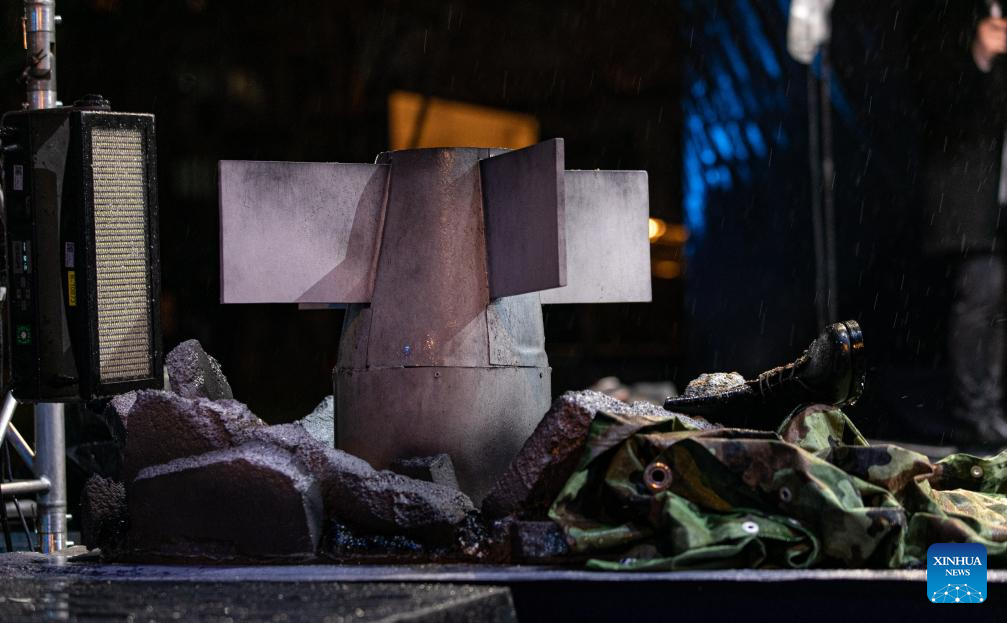 A bomb model is seen during a commemoration event marking the 25th anniversary of NATO bombing of Yugoslavia, in Prokuplje, Serbia, on March 24, 2024. Serbia will never surrender its province of Kosovo and Metohija nor join the NATO alliance, said Serbian President Aleksandar Vucic here Sunday at a commemoration event marking the 25th anniversary of NATO bombing of Yugoslavia. (Photo by Wang Wei/Xinhua)