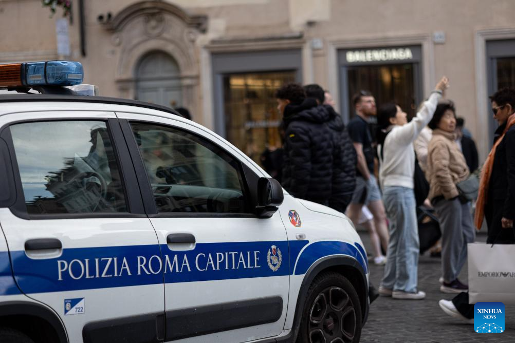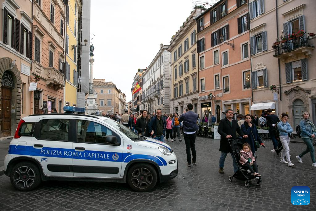 A police car parks at the Spanish Square in Rome, Italy, March 24, 2024. Italy's Ministry of the Interior said on Saturday that it has ordered the security level at "sensitive" sites to be raised in Rome and other cities, including airports, train stations, as well as key cultural and religious sites. (Xinhua/Li Jing)