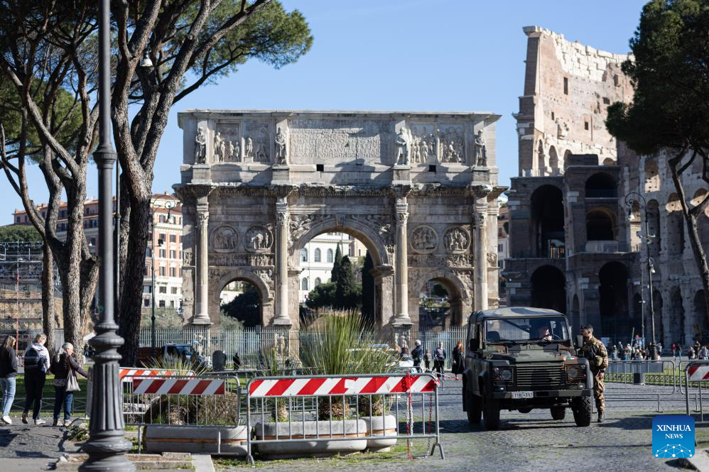 Italian soldiers stand guard in front of the Arch of Constantine in Rome, Italy, March 25, 2024. Italy's Ministry of the Interior said on Saturday that it has ordered the security level at "sensitive" sites to be raised in Rome and other cities, including airports, train stations, as well as key cultural and religious sites. (Xinhua/Li Jing)