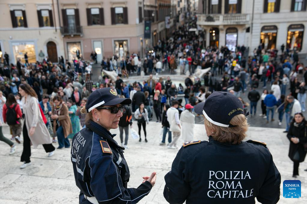 Police officers work at the Spanish Square in Rome, Italy, March 24, 2024. Italy's Ministry of the Interior said on Saturday that it has ordered the security level at "sensitive" sites to be raised in Rome and other cities, including airports, train stations, as well as key cultural and religious sites. (Xinhua/Li Jing)