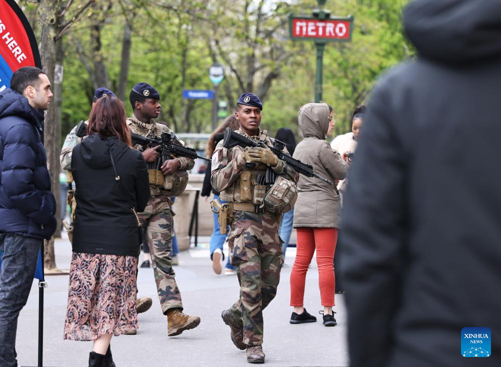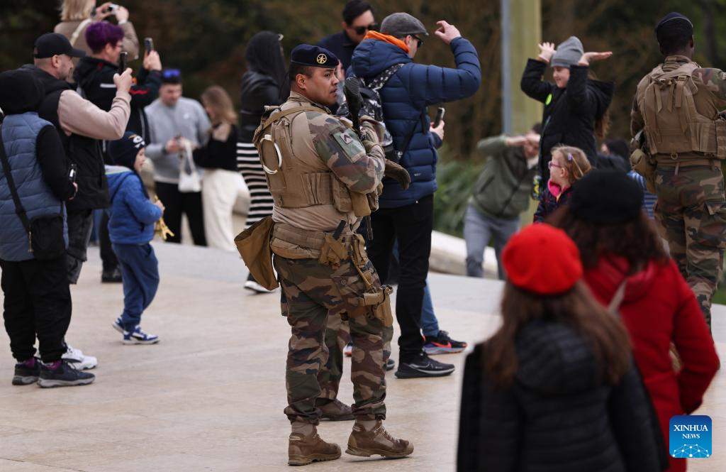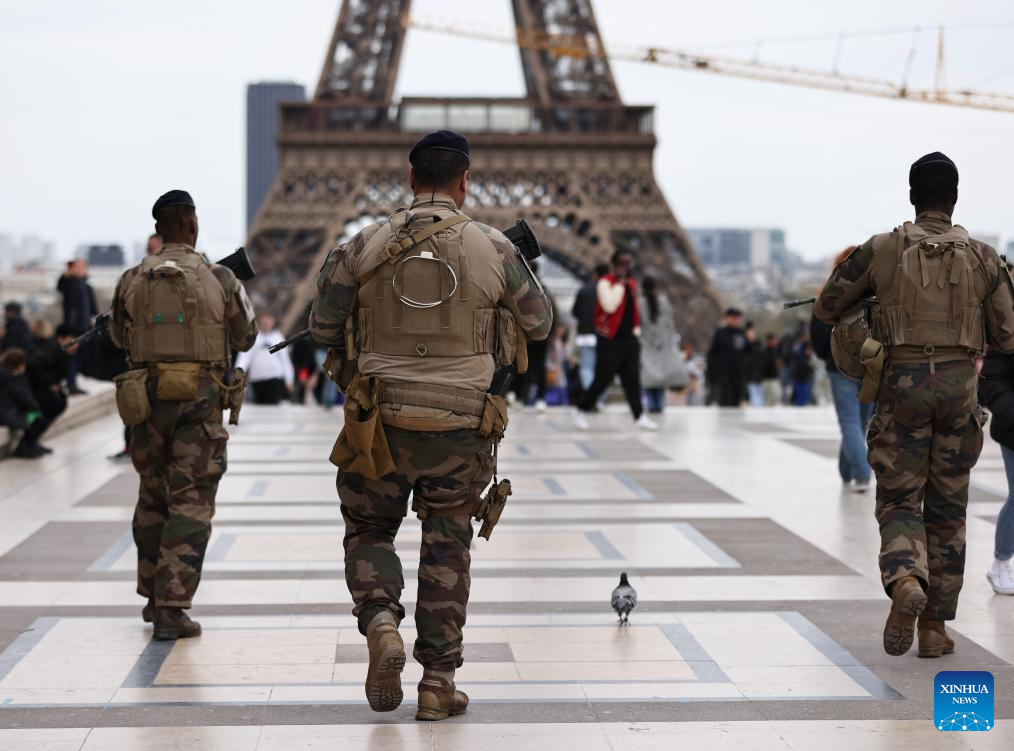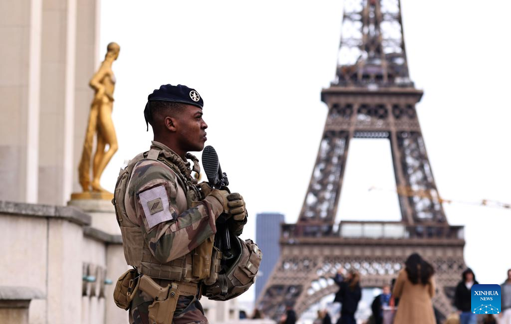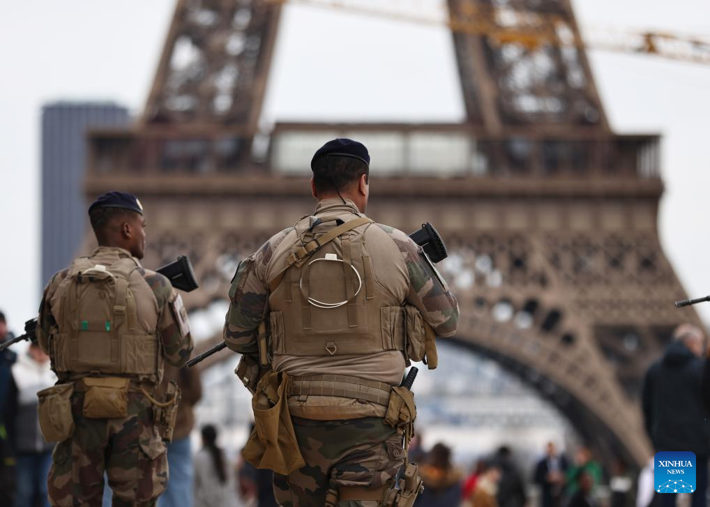 Armed French soldiers patrol at the Trocadero place near the Eiffel Tower in Paris, France, on March 25, 2024. The French government decided on Sunday to raise the national security alert system Vigipirate to its highest level to deal with the potential threat the country is facing after Friday's deadly terrorist attack in Russia's capital Moscow. (Xinhua/Gao Jing)