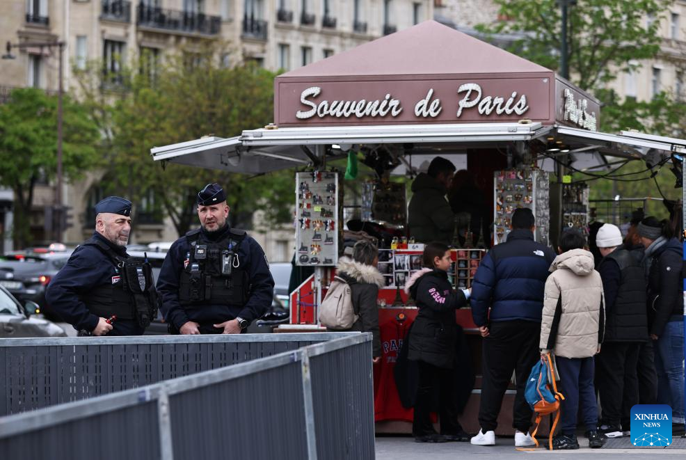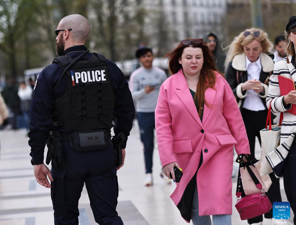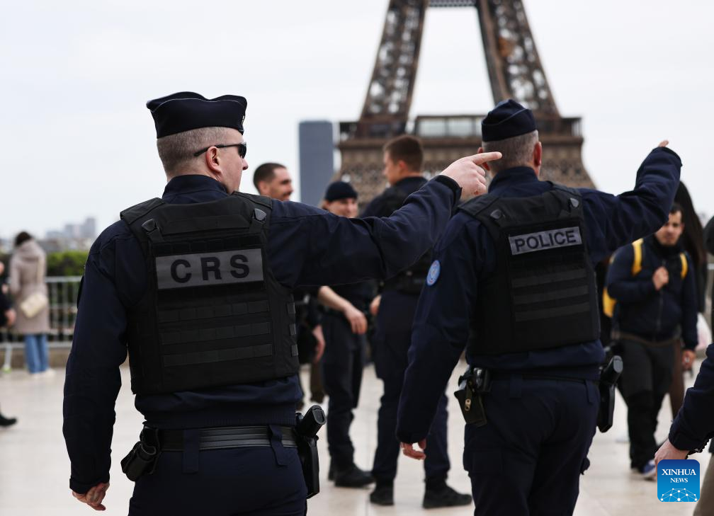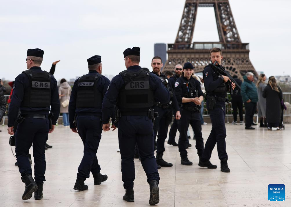 Policemen work near the Eiffel Tower in Paris, France, on March 25, 2024. The French government decided on Sunday to raise the national security alert system Vigipirate to its highest level to deal with the potential threat the country is facing after Friday's deadly terrorist attack in Russia's capital Moscow. (Xinhua/Gao Jing)