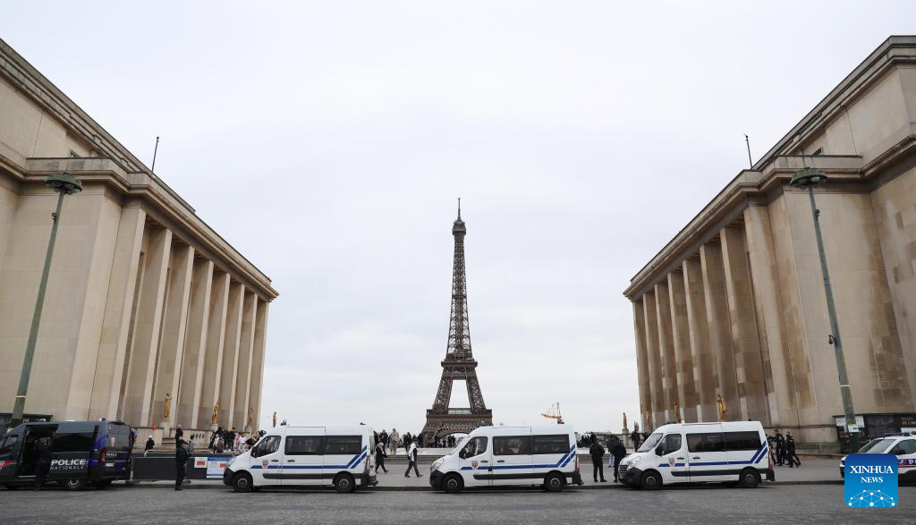 French police vehicles are seen at the Trocadero place near the Eiffel Tower in Paris, France, on March 25, 2024. The French government decided on Sunday to raise the national security alert system Vigipirate to its highest level to deal with the potential threat the country is facing after Friday's deadly terrorist attack in Russia's capital Moscow. (Xinhua/Gao Jing)