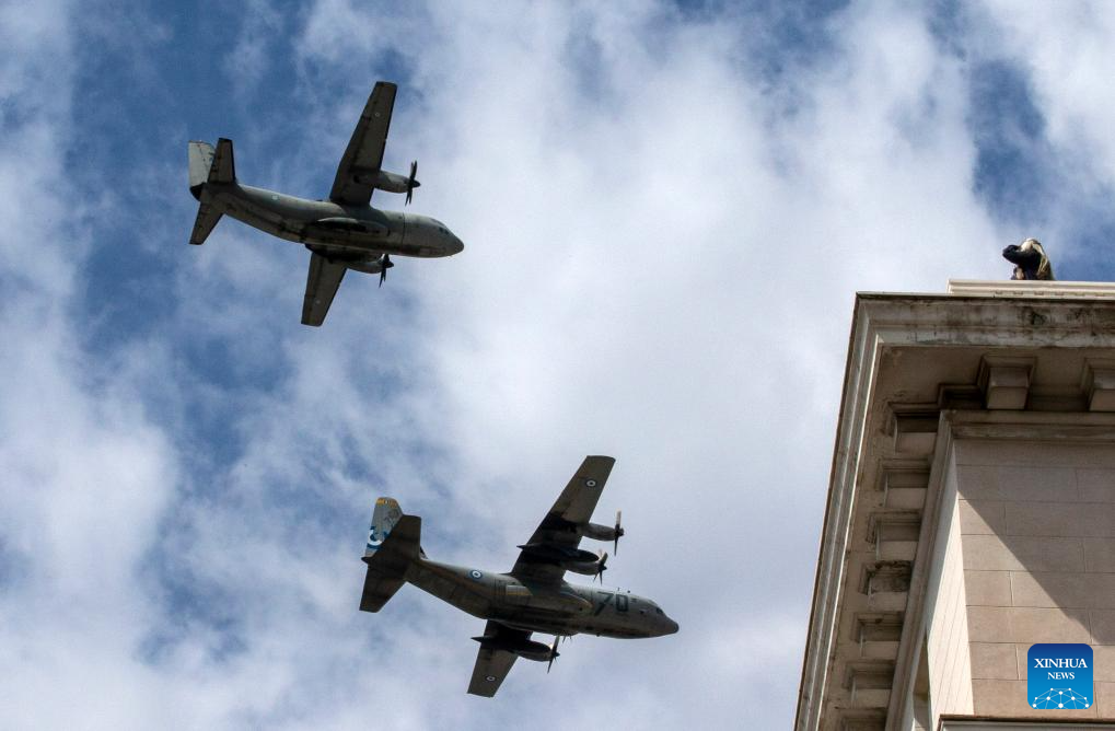 Airplanes fly during a military parade commemorating the Greek Independence Day, in Athens, Greece, on March 25, 2024. Greece commemorated on Monday the 203rd anniversary of its Independence Day. (Xinhua/Marios Lolos)