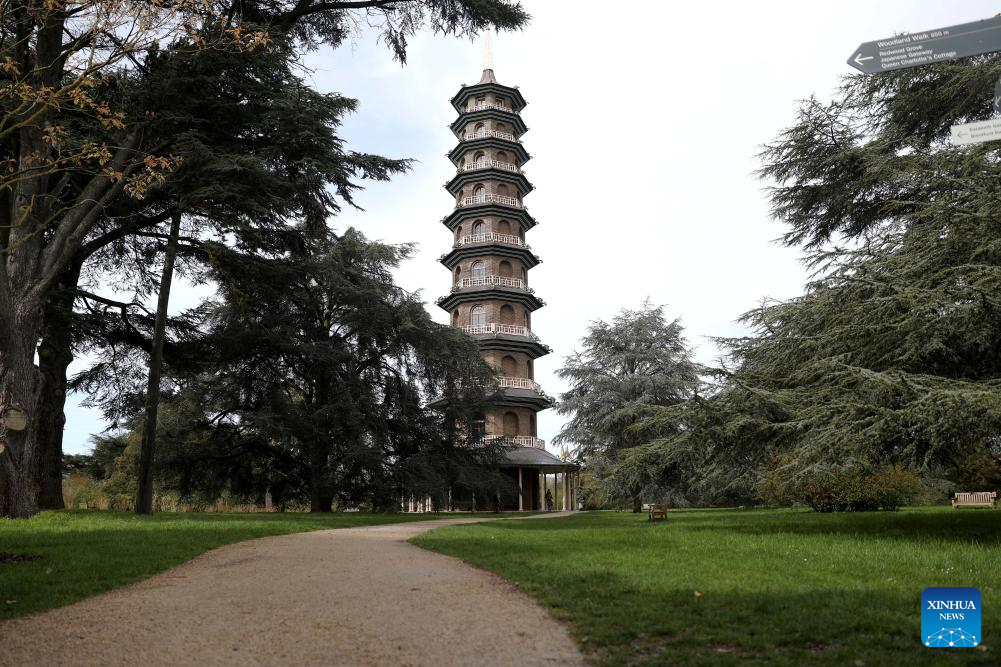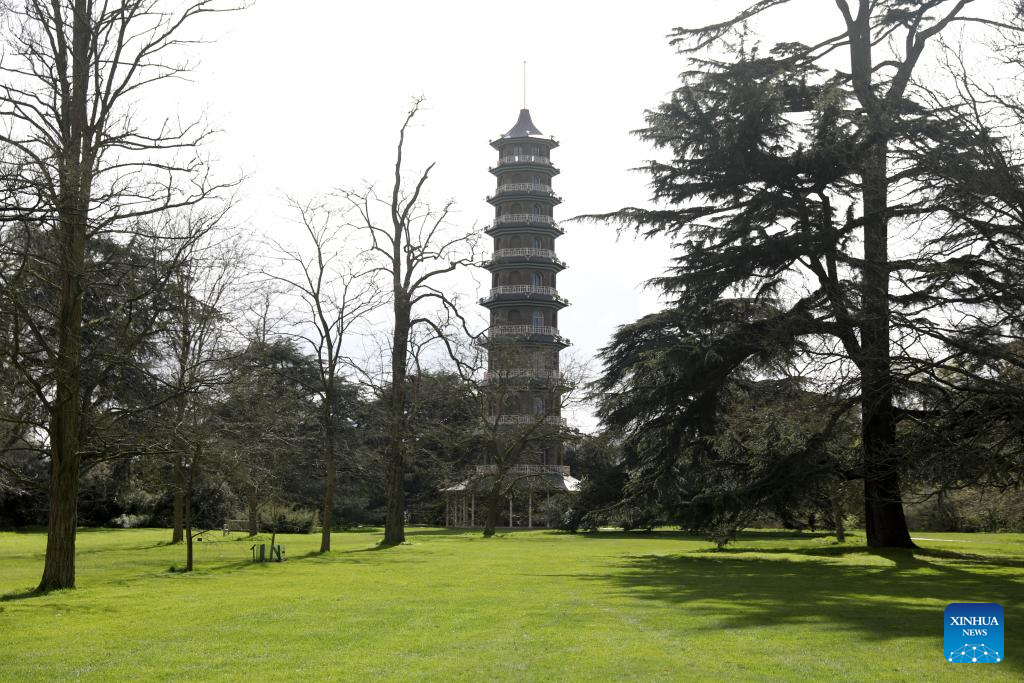 This photo taken on March 27, 2024 shows a view of the Great Pagoda at Kew Gardens in London, Britain. (Xinhua/Li Ying)