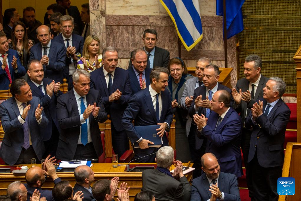 Greek Prime Minister Kyriakos Mitsotakis (C) is congratulated at the Greek Parliament in Athens, Greece, on March 28, 2024. The Greek government survived on Thursday a no-confidence motion tabled by the opposition over the handling of a series of crises and challenges, including a deadly train accident with 57 fatalities last year. (Xinhua/Marios Lolos)