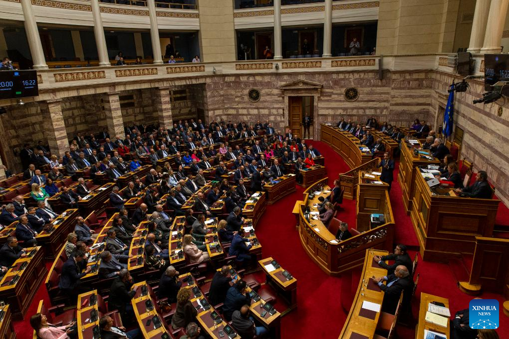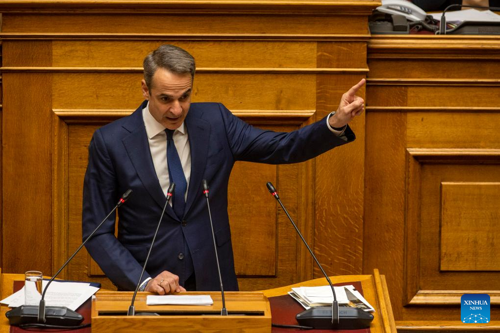Greek Prime Minister Kyriakos Mitsotakis addresses the Greek Parliament in Athens, Greece, on March 28, 2024. The Greek government survived on Thursday a no-confidence motion tabled by the opposition over the handling of a series of crises and challenges, including a deadly train accident with 57 fatalities last year. (Xinhua/Marios Lolos)