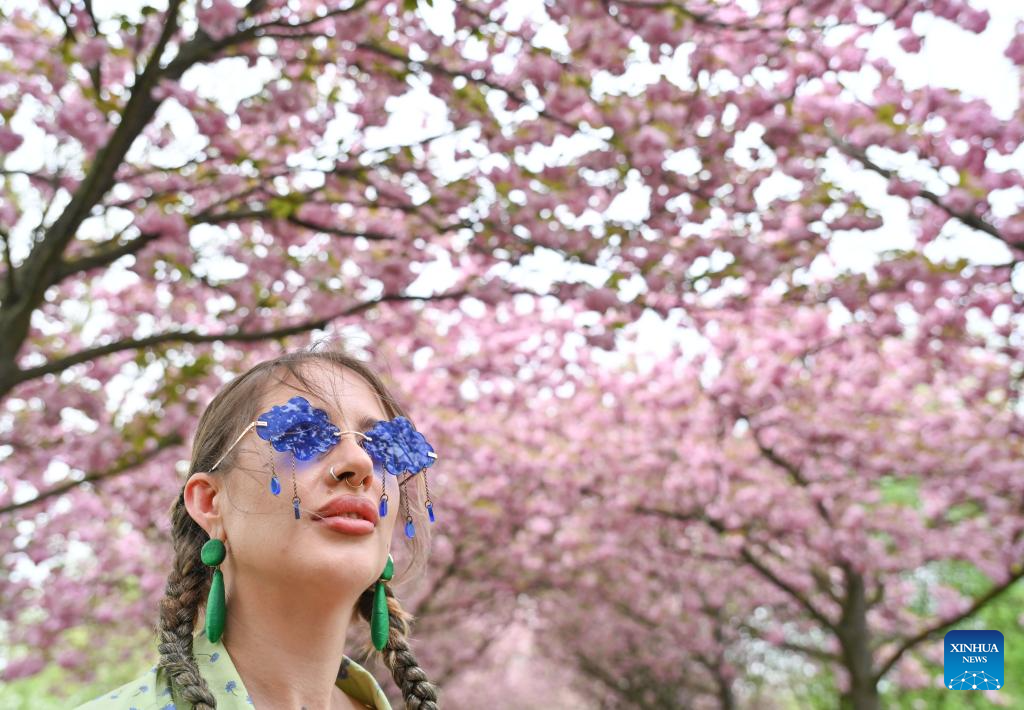 A woman looks at cherry blossoms in Berlin, Germany, April 9, 2024. (Xinhua/Ren Pengfei)
