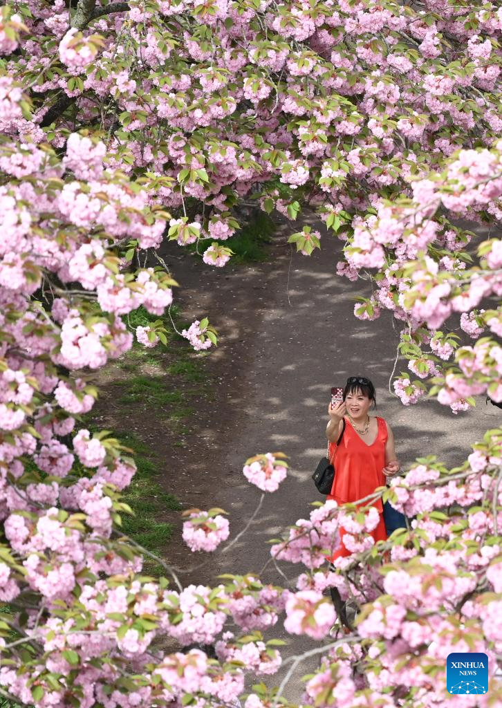A woman takes photos of cherry blossoms in Berlin, Germany, April 9, 2024. (Xinhua/Ren Pengfei)