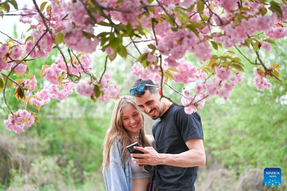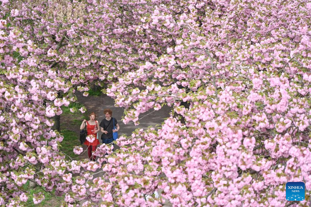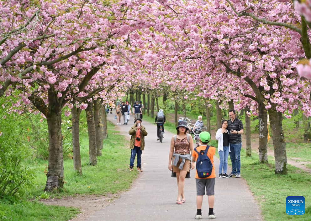 People walk under cherry blossom trees in Berlin, Germany, April 9, 2024. (Xinhua/Ren Pengfei)