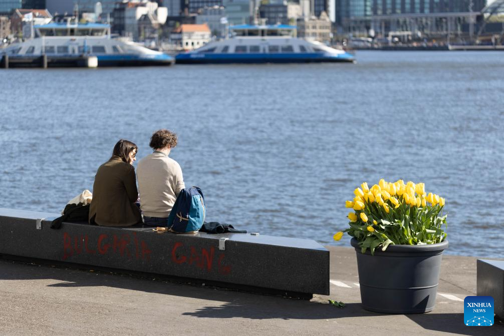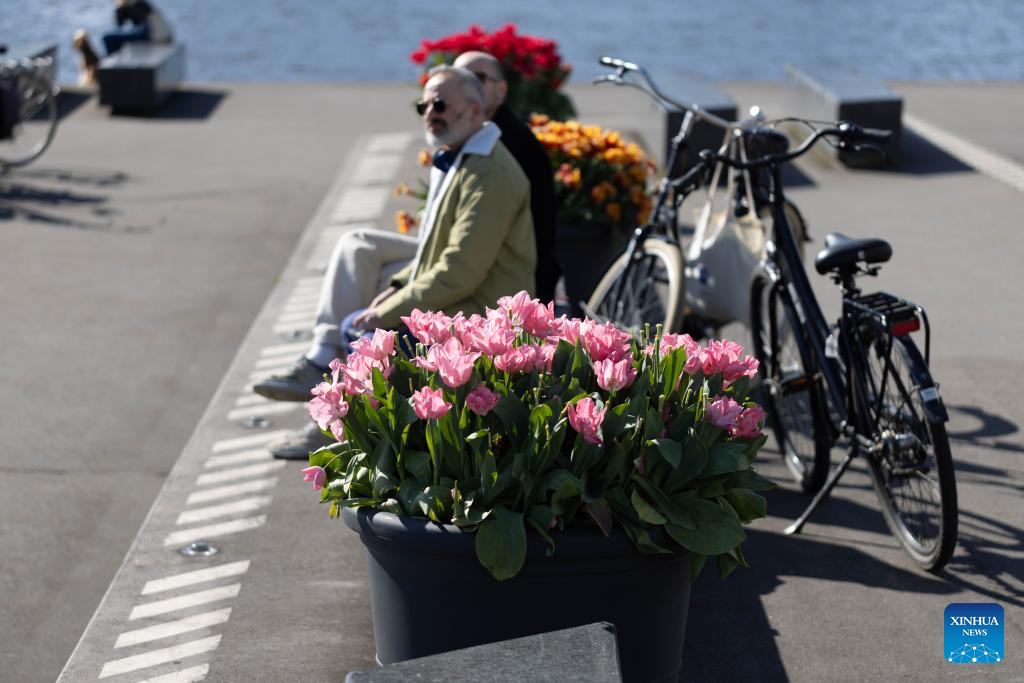 People enjoy sunshine and tulips during the 2024 Tulip Festival in Amsterdam, the Netherlands, April 10, 2024. (Photo by Sylvia Lederer/Xinhua)