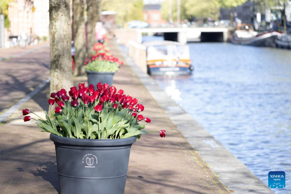 Flowerpots with tulips are seen on the street during the 2024 Tulip Festival in Amsterdam, the Netherlands, April 10, 2024. (Photo by Sylvia Lederer/Xinhua)