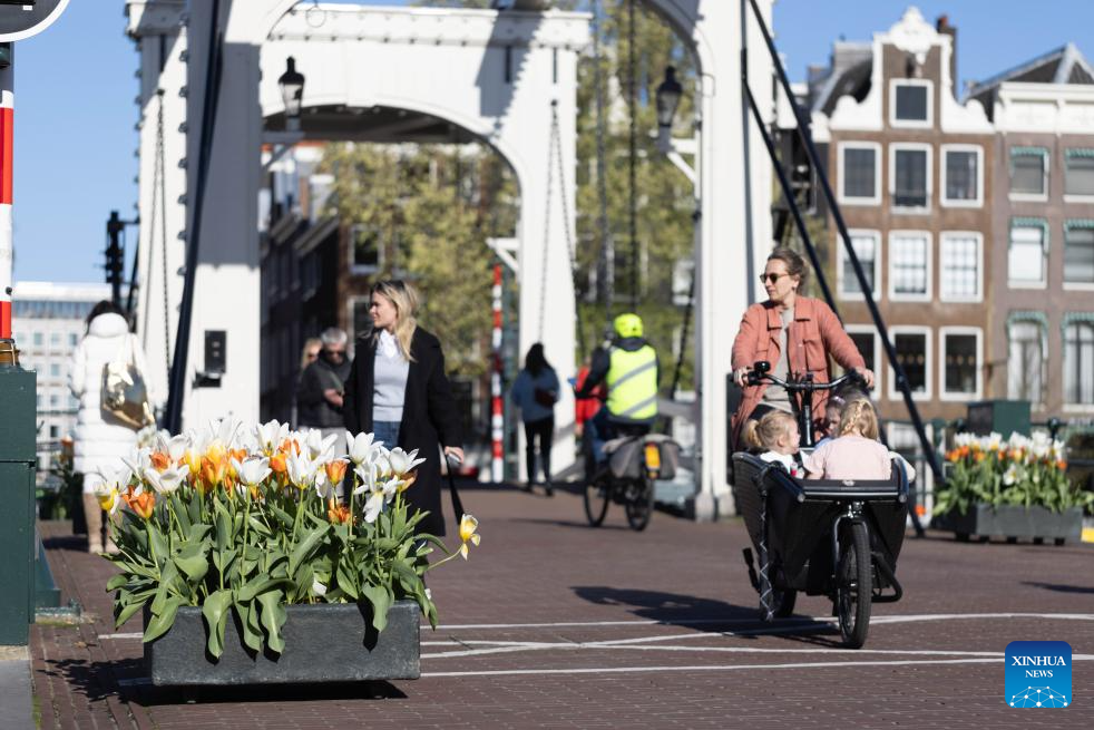 This photo taken on April 10, 2024 shows a street view at the Skinny Bridge during the 2024 Tulip Festival in Amsterdam, the Netherlands. (Photo by Sylvia Lederer/Xinhua)