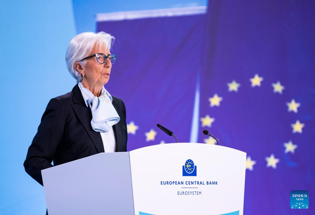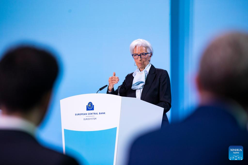 European Central Bank (ECB) President Christine Lagarde attends a press conference at the ECB headquarters in Frankfurt, Germany, April 11 2024. The European Central Bank (ECB) on Thursday decided to leave key interest rates unchanged after its regular rate-setting meeting here. (Xinhua/Zhang Fan)